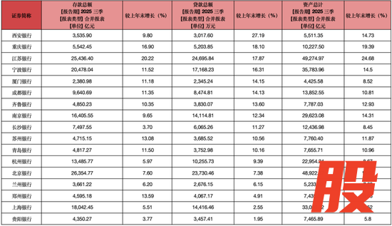 截至2025年三季度末,17家城商行中,有10家城商行的资产总额增速在10%以上,有3家增速超过15%,其分别为江苏银行以49274.97亿元的资产总额和24.68%的增速排名双第一。